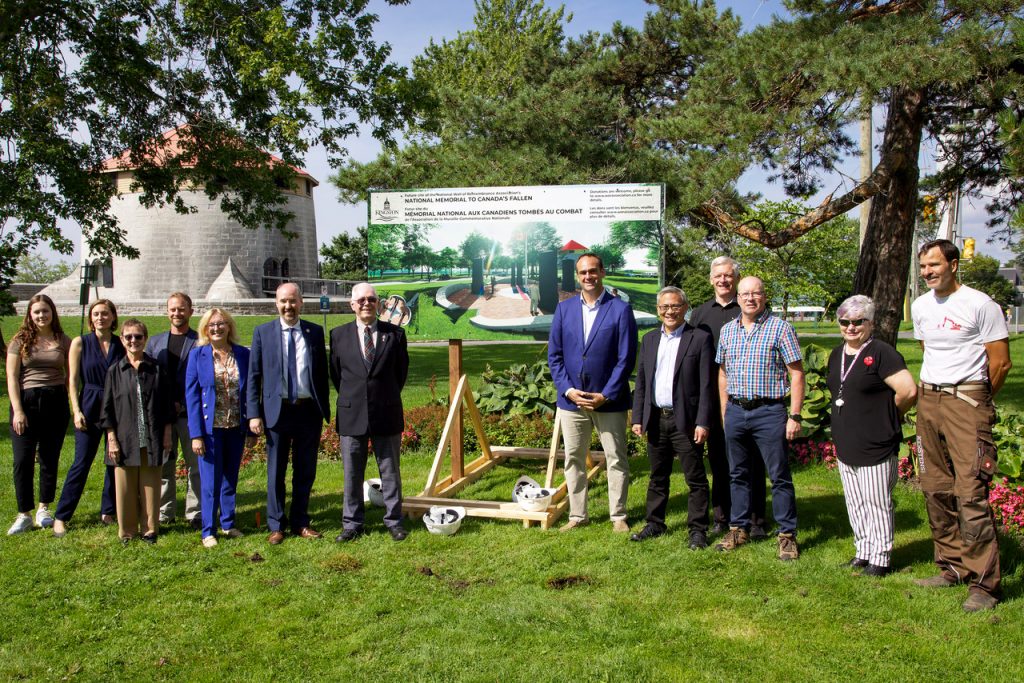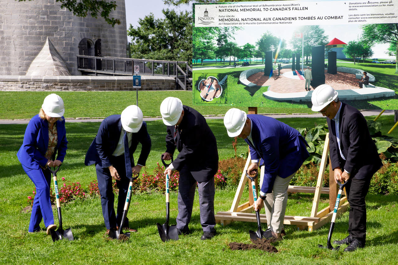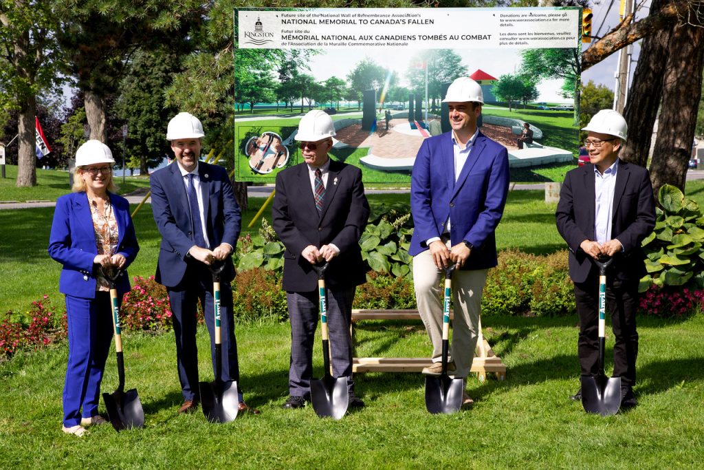14 August 2023 – NWORA Memorial Sod-Turning Ceremony – Before the Dig! From left to right: Conny Glenn (District Councillor – Sydenham, City of Kingston); Bryan Paterson (Mayor, City of Kingston); Gary Coulter (Chair, National Wall of Remembrance Association); Mark Gerretsen (Member of Parliament, Kingston and the Islands); and Ted Hsu (Member of Provincial Parliament, Kingston and the Islands).