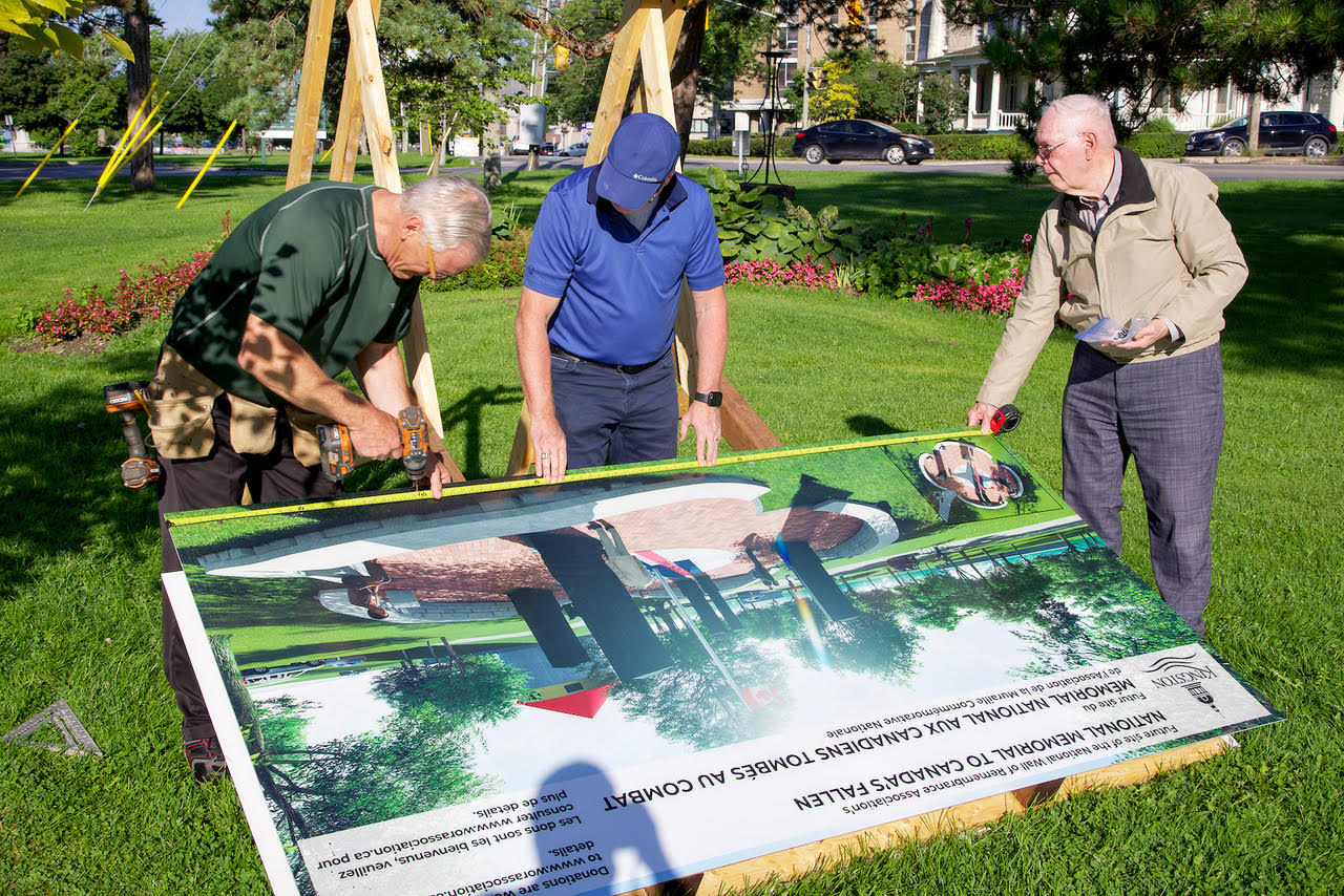The NWORA Executive prepare the Site board just prior to the Sod-Turning Ceremony. The board states: “Future site of the National Wall of Remembrance Association’s NATIONAL MEMORIAL TO CANADA’S FALLEN. Donations are welcome, please go to www.worassociation.ca for more details.” From Left to Right: Louis Cyr (NWORA Secretary/Treasurer); Bruce Ewing (NWORA Vice Chair); and Gary Coulter (NWORA Chair)
