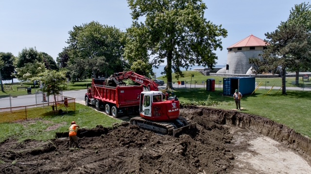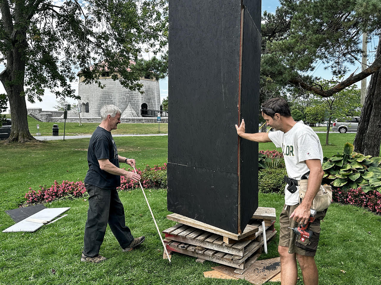 The NWORA Executive prepare the Site board just prior to the Sod-Turning Ceremony. The board states: “Future site of the National Wall of Remembrance Association’s NATIONAL MEMORIAL TO CANADA’S FALLEN. Donations are welcome, please go to www.worassociation.ca for more details.” From Left to Right: Louis Cyr (NWORA Secretary/Treasurer); Bruce Ewing (NWORA Vice Chair); and Gary Coulter (NWORA Chair)